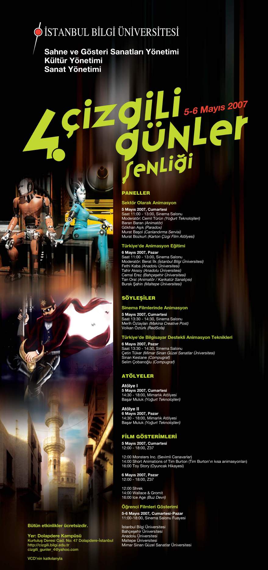 Her dönem farklı konu ve teknikleri ele alan şenlik bu yıl, teknolojinin tüm olanaklarını kullanarak hızla ilerleyen ve gelişen “Bilgisayar Destekli Animasyon” konusunu ele alıyor. Son dönemlerde ülkemizde, yapılan filmlerde animasyon kullanımının artması, sektöre bir canlılık getirdi. İstanbul Bilgi Üniversitesi Görsel İletişim Tasarımı Bölümü’nün desteği ile hazırlanan şenlik geçen yıllarda olduğu gibi, BİLGİ Dolapdere Kampüsü’nde gerçekleşiyor. Şenlikte atölye çalışmaları, film gösterimleri, panel ve söyleşilerin yanı sıra farklı üniversitelerden pek çok öğrencinin çalışmaları da sergileniyor.